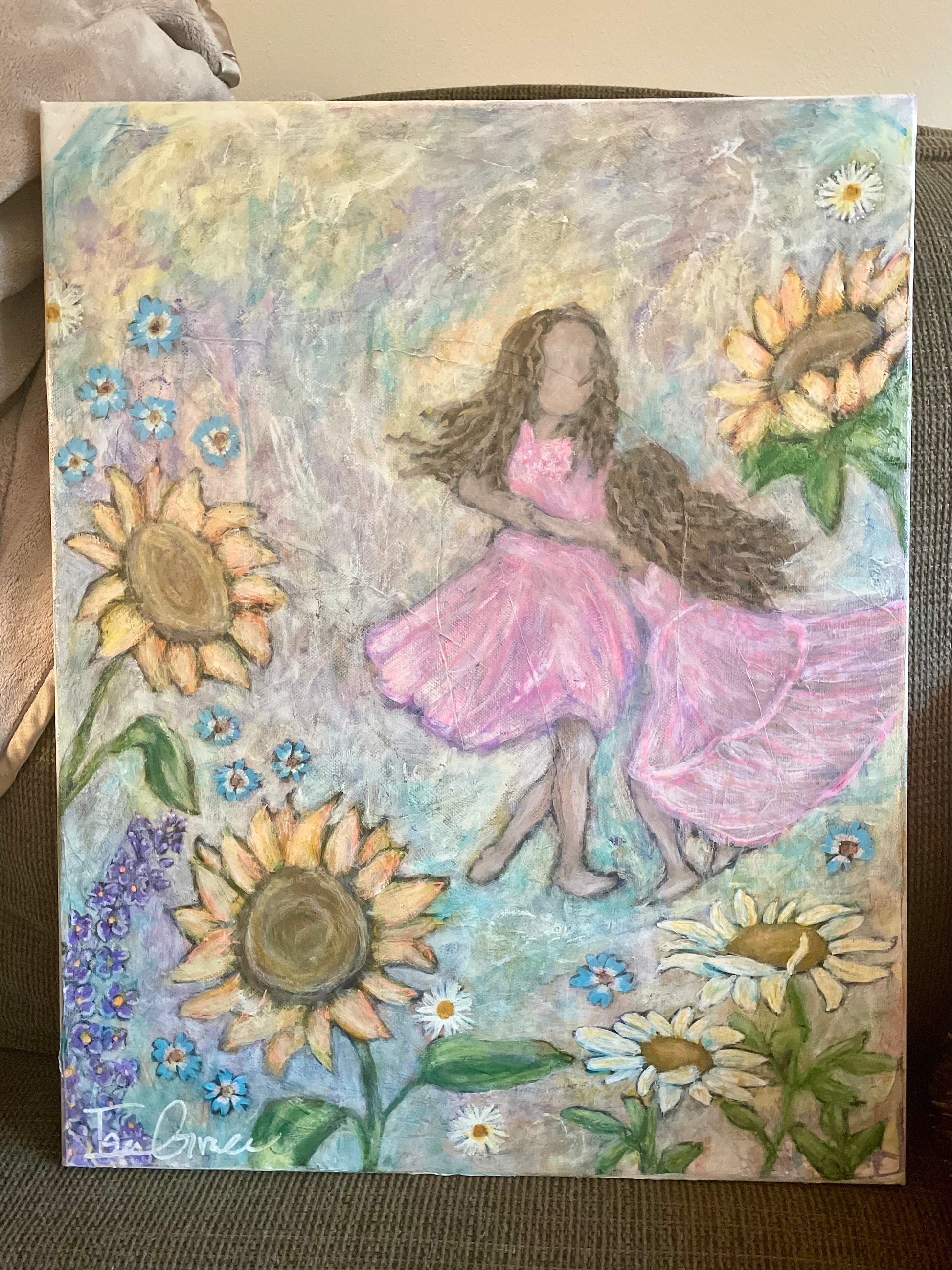 This 16x20 inch mixed-media painting represents childlike joy, freedom, and the beauty of childhood.
